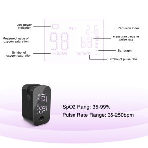 Phạm vi hiển thị: SpO2: 35% – 99% / Nhịp tim: 25 – 250 bpm / PI: 0 – 20%.